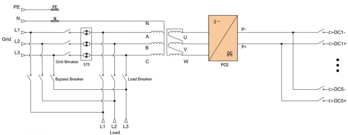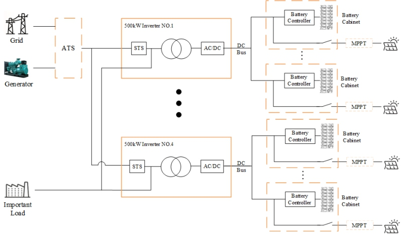 1.Loads excedentes 500 kW, commendatur uti magna capacitate 500 kW unius-unitatis energiae invertentis repositae, quae possunt sustentare usque ad quattuor notas parallelas nexus, atotal potentiae e 2 MW; assequendi.